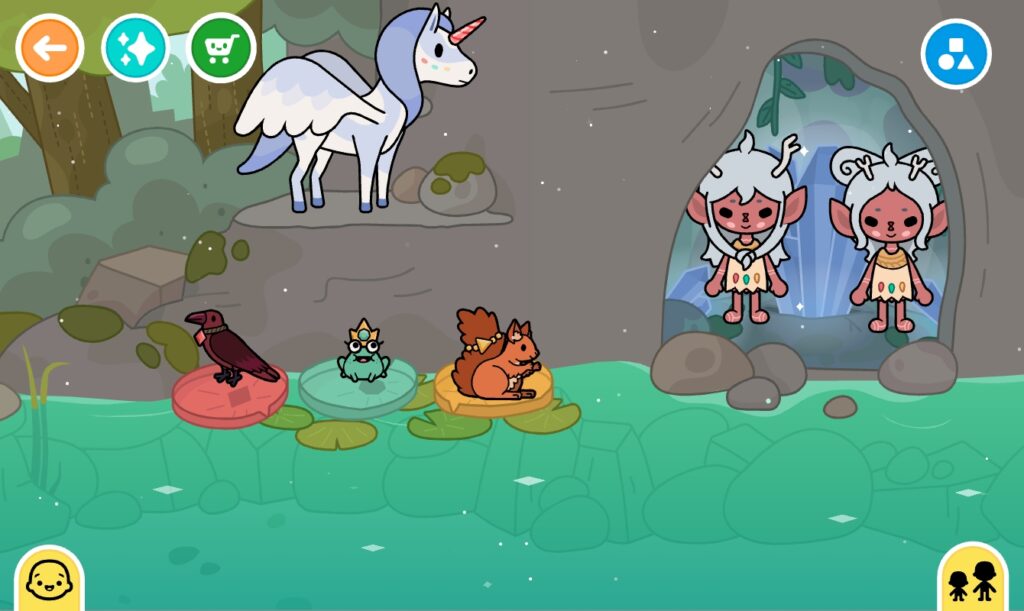 So first, go to the Waterfall. Then try to find the red crow, the green frog, and then the squirrel. Notice the colored gems on their accesories? Match each color to the matching lily pad. The waterfall will stop flowing and there will be a gem. Tap on the gem and you will see it glow and then two fairies and a unicorn will appear!🧚🧚🦄 Then scroll throughout the woods and you will see other creatures, too!