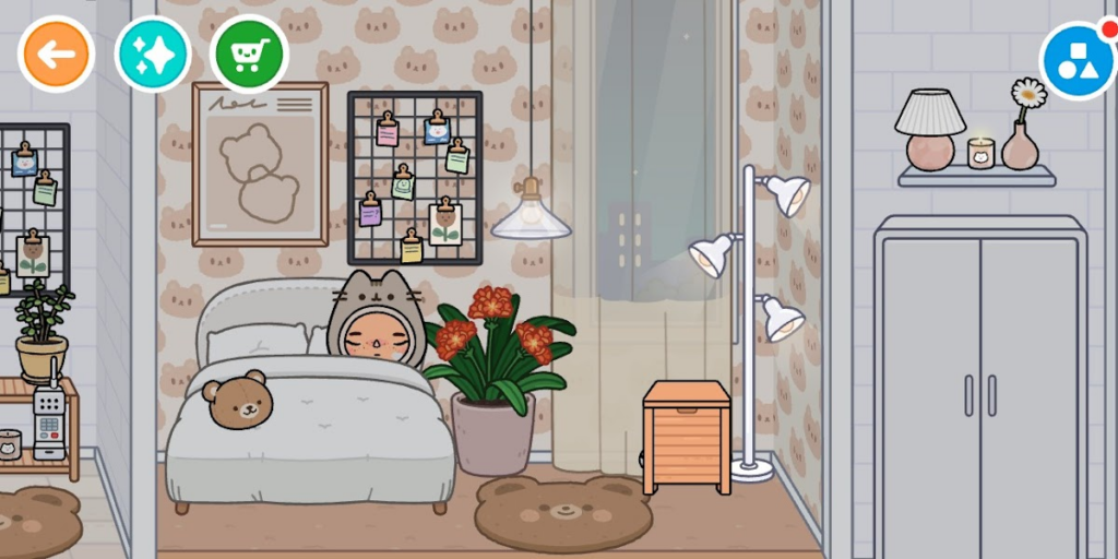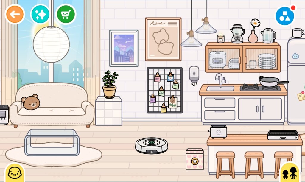 Her apartment has a cute teddy bear bedroom and a kitchen and living room combo in the left side. I added tons of white and beige furniture to get the right cozy aesthetic for my build!